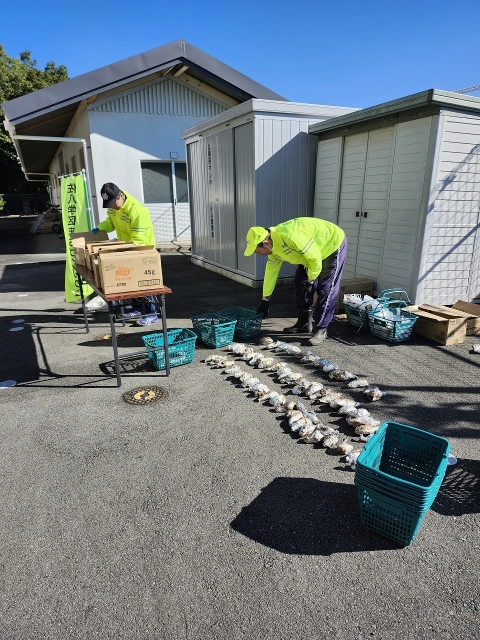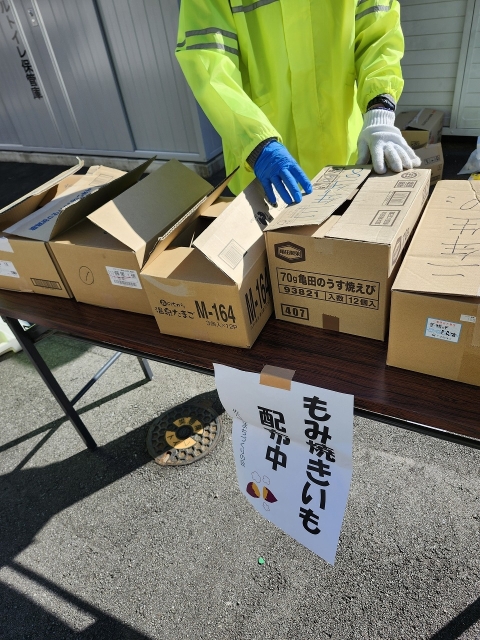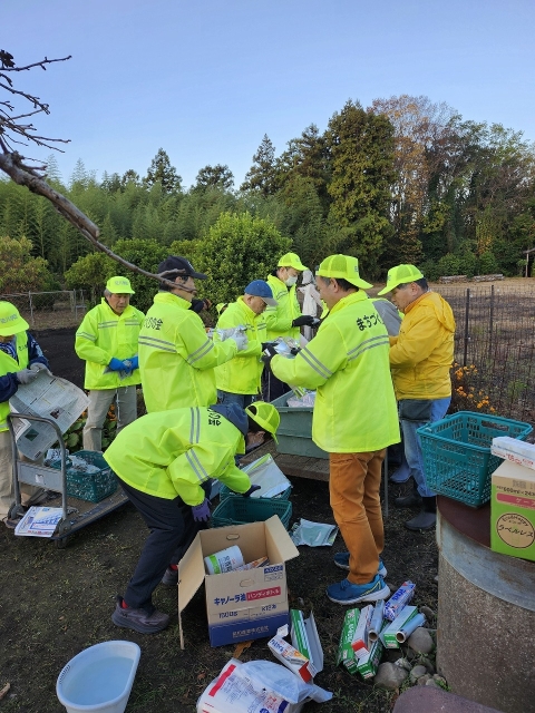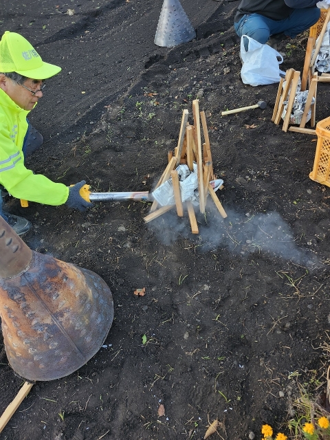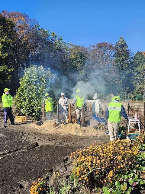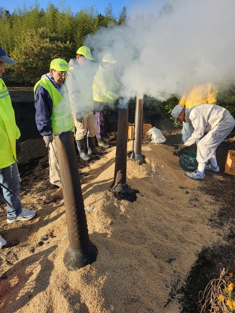 地域情報交流委員会では、令和8年11月29日(土)午前7時から午後12時まで佐八小西側畑で、11月16日(日)に掘ったいも200個ほどをもみがらを焼きながらその中に入れて焼きました。15人の参加がありました。小春日和の穏やかな、空が真っ青な秋晴れとなり、絶好のやきいも日和となりました。この方法は時間がかかるので、初めは時間までに焼けるのか心配でしたが、なんとか間に合いました。「紅はるか」のいもは、ねっとり甘い食感で、じっくりと焼けば、さらにおいしくなります。佐八小の授業参観終了後、児童、先生方、保護者の方に配布しました。
